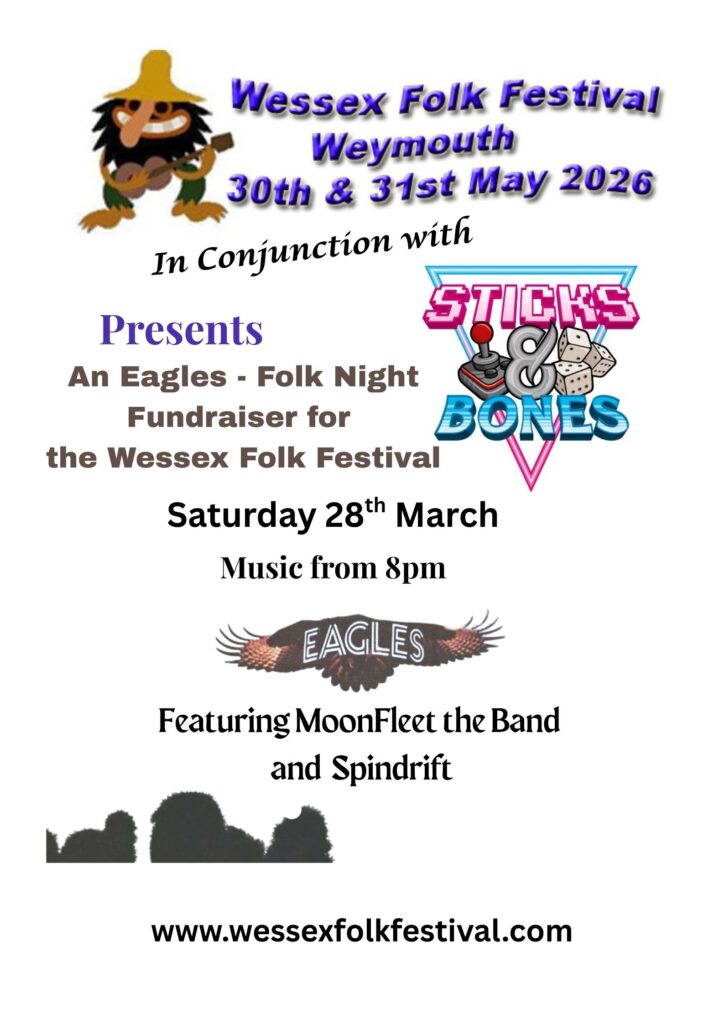 After the successful ‘Last Dance Ceilidh’ at Hope Church in Weymouth last week. (You can read all about it in the Newsletter.. Sign up if you haven’t already?) The Festival organisers are putting on a fund raising evening at the Sticks & Bones in Hope square Weymouth of an Eagles and Folk Night with a nice array of Music .. See below for details.